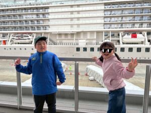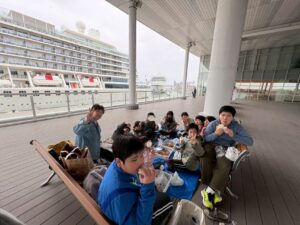 大きいクルーズ船を眺めながら美味しいご飯を食べました🍙